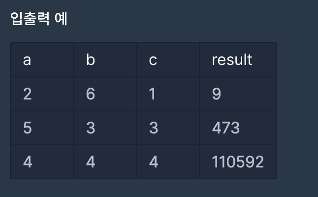 세 주사위를 굴렸을 때 나온 숫자를 각각 a, b, c라고 했을 때 얻는 점수는 다음과 같습니다.