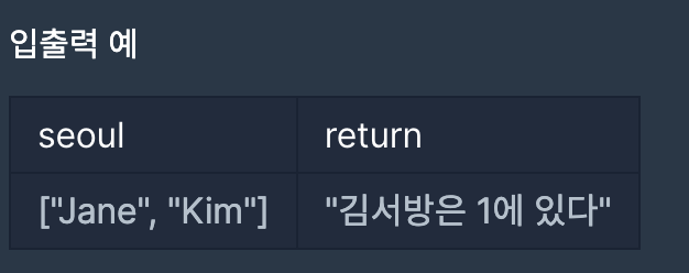 String형 배열 seoul의 element중 "Kim"의 위치 x를 찾아, "김서방은 x에 있다"는 String을 반환하는 함수, solution을 완성하세요.