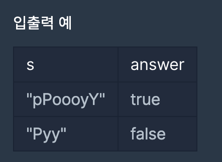 예를 들어 s가 "pPoooyY"면 true를 return하고 "Pyy"라면 false를 return합니다.