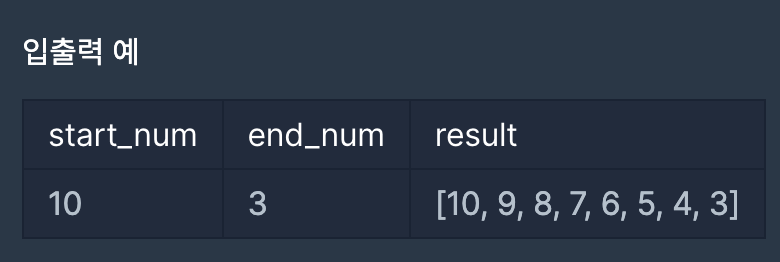 정수 start_num와 end_num가 주어질 때, start_num에서 end_num까지 1씩 감소하는 수들을 차례로 담은 리스트를 return하도록 solution 함수를 완성해주세요.