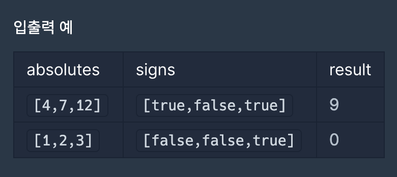 어떤 정수들이 있습니다. 이 정수들의 절댓값을 차례대로 담은 정수 배열 absolutes와 이 정수들의 부호를 차례대로 담은 불리언 배열 signs가 매개변수로 주어집니다. 실제 정수들의 합을 구하여 return 하도록 solution 함수를 완성해주세요.