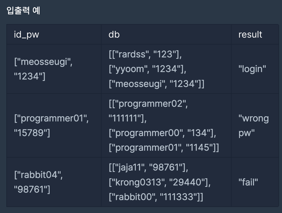 머쓱이는 프로그래머스에 로그인하려고 합니다. 머쓱이가 입력한 아이디와 패스워드가 담긴 배열 id_pw와 회원들의 정보가 담긴 2차원 배열 db가 주어질 때, 다음과 같이 로그인 성공, 실패에 따른 메시지를 return하도록 solution 함수를 완성해주세요.