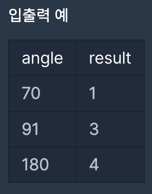 각에서 0도 초과 90도 미만은 예각, 90도는 직각, 90도 초과 180도 미만은 둔각 180도는 평각으로 분류합니다. 각 angle이 매개변수로 주어질 때 예각일 때 1, 직각일 때 2, 둔각일 때 3, 평각일 때 4를 return하도록 solution 함수를 완성해주세요.
