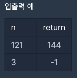 n이 양의 정수 x의 제곱이라면 x+1의 제곱을 리턴하고, n이 양의 정수 x의 제곱이 아니라면 -1을 리턴하는 함수를 완성하세요.