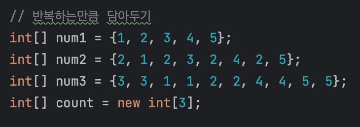 -맞는 문제 갯수를 count해주는 count배열변수도 생성. 수포자가 총 3명이니까 배열의 크기는 3