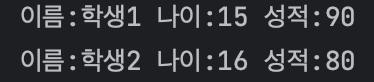 System.out.println("이름:"+student2.name+" 나이:"+student2.age+" 성적:"+student2.grade);