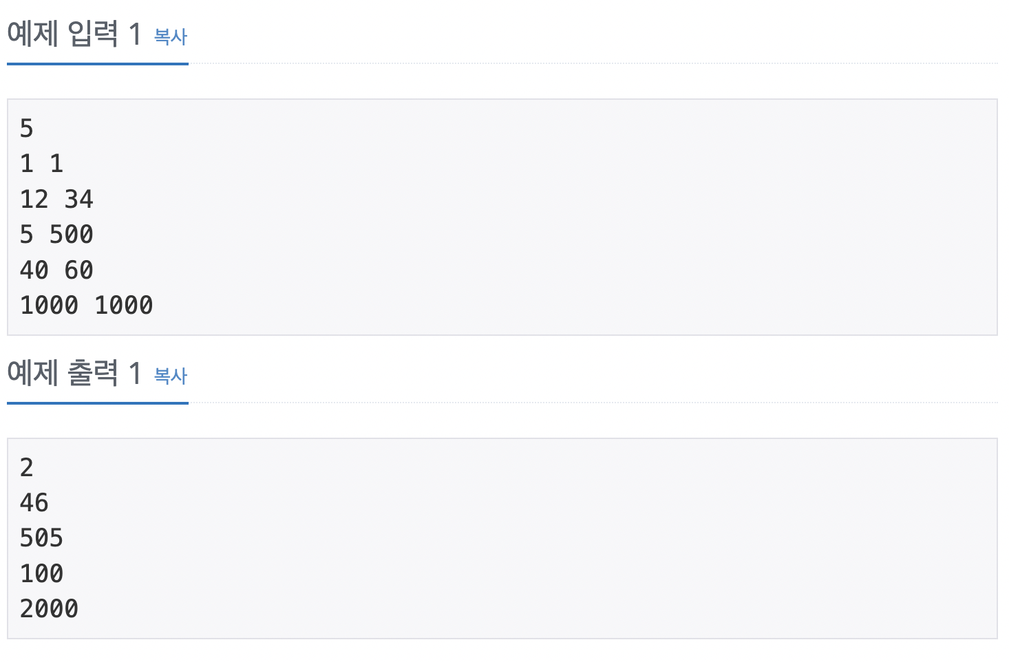 첫 줄에 테스트케이스의 개수 T가 주어진다. T는 최대 1,000,000이다. 다음 T줄에는 각각 두 정수 A와 B가 주어진다. A와 B는 1 이상, 1,000 이하이다.