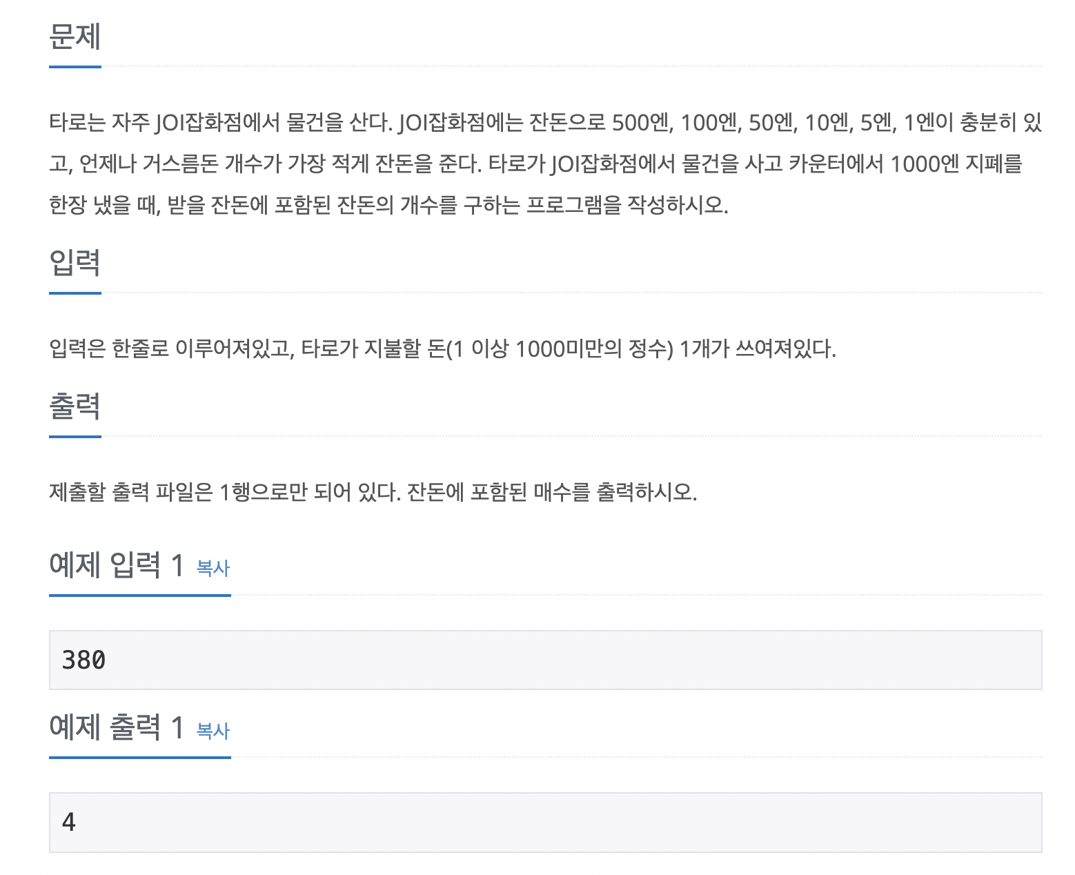 1000 - 380이 거스름돈이고 그 거스름돈을 저기 동전들 골라서 거슬러줘야하는데 그 동전 개수가 최소여야한다는 말임