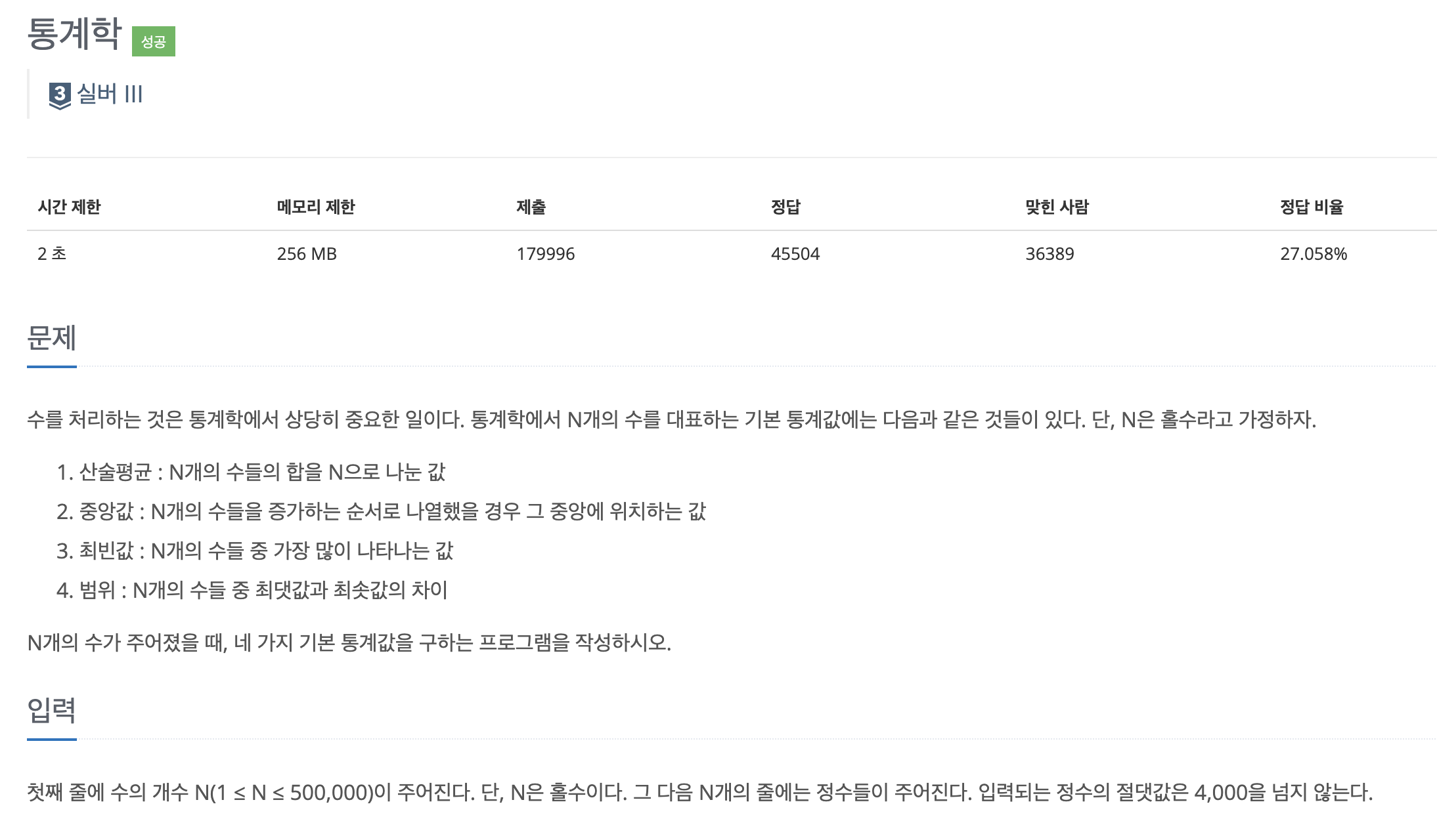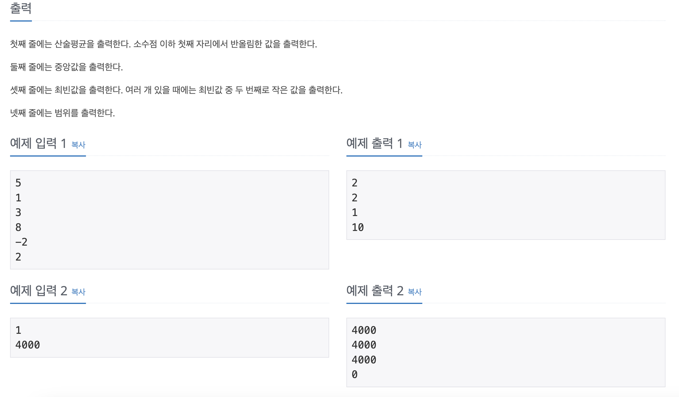 www.acmicpc.net/problem/2108 2108번: 통계학 첫째 줄에 수의 개수 N(1 ≤ N ≤ 500,000)이 주어진다. 그 다음 N개의 줄에는 정수들이 주어진다. 입력되는 정수의 절댓값은 4,000을 넘지 않는다. www.acmicpc.net 문