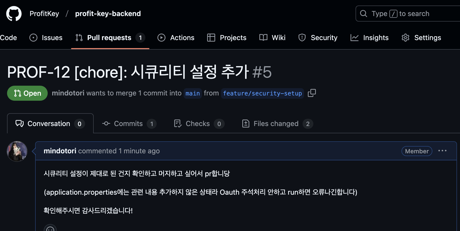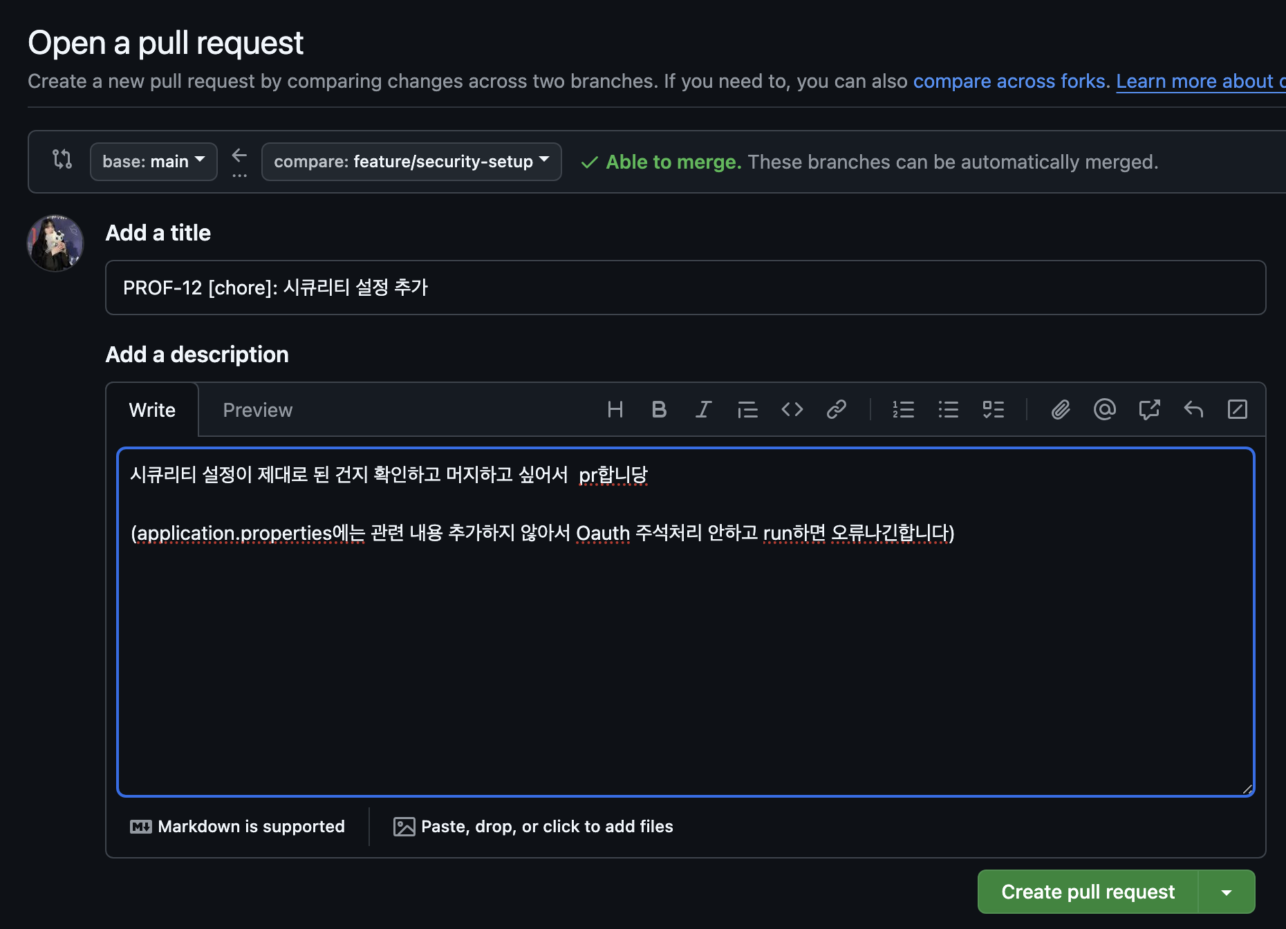 feature 브랜치에서 스프링 시큐리티 설정을 했는데 잘 된건지 모르겠어서 팀원분들에게 여쭤보고 main에 merge하려고 Pr을 해보았다