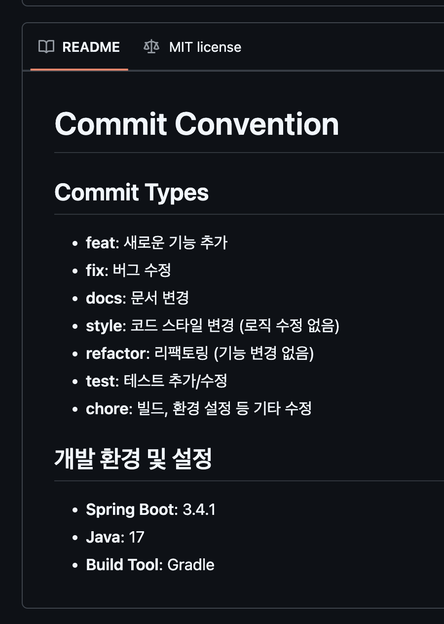 커밋 컨벤션과 개발 환경 요약도 read.me에 적어두었다