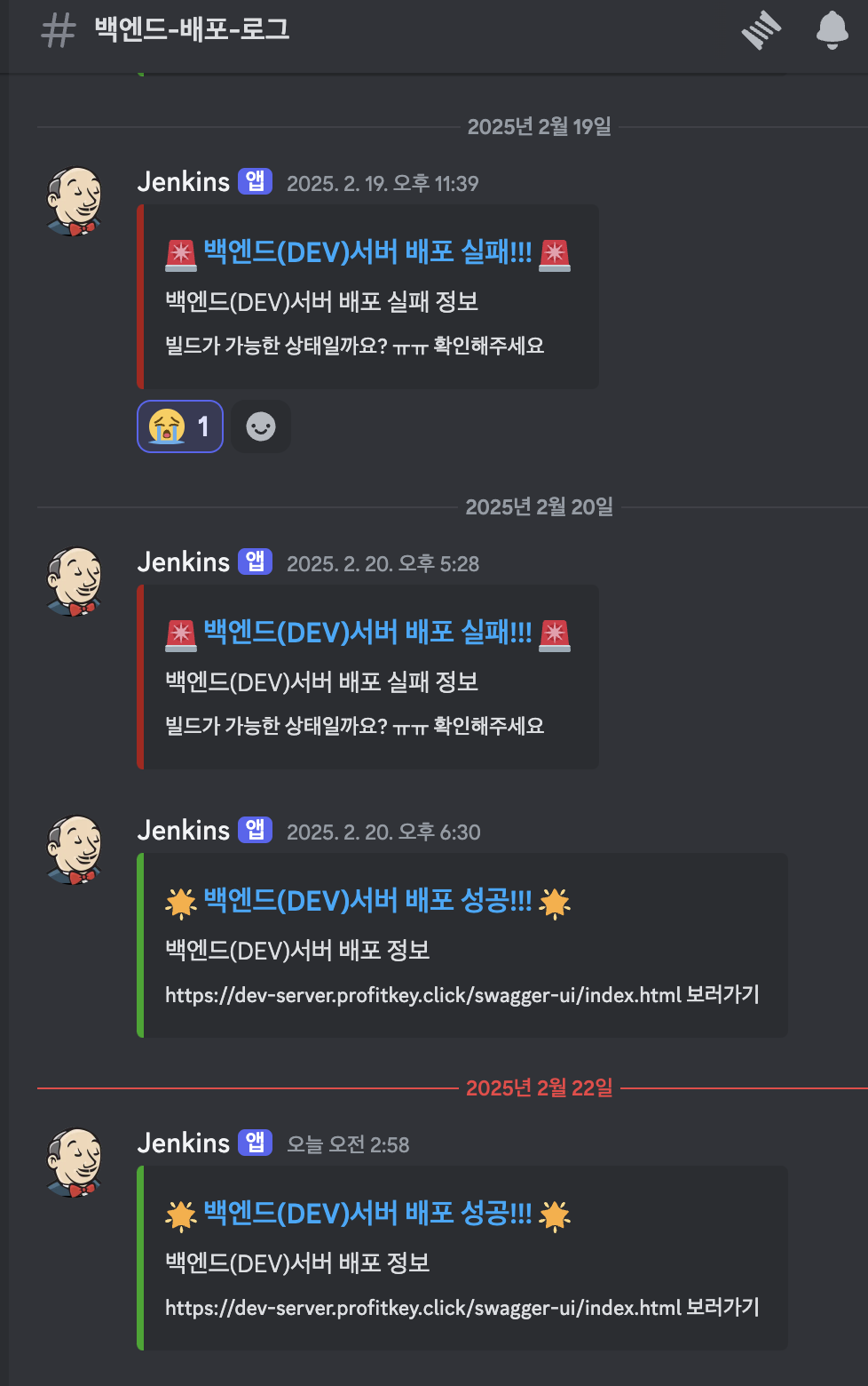 이런식으로 중간중간 배포를 해주면서 백엔드 API 변동사항을 프론트도 확인할 수 있도록 진행중이다!