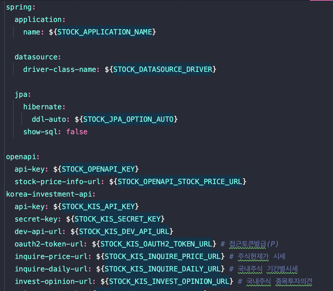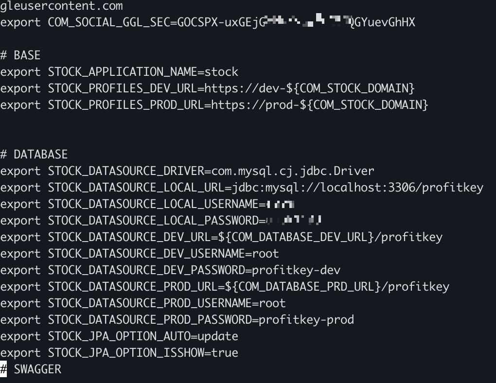 이런 정보가 노출되지 않기 위해 환경변수 처리를 하는데 yml 파일에서 ${} 이런식으로 처리하고, 터미널에서 그 값을 넣어 관리를 한다.