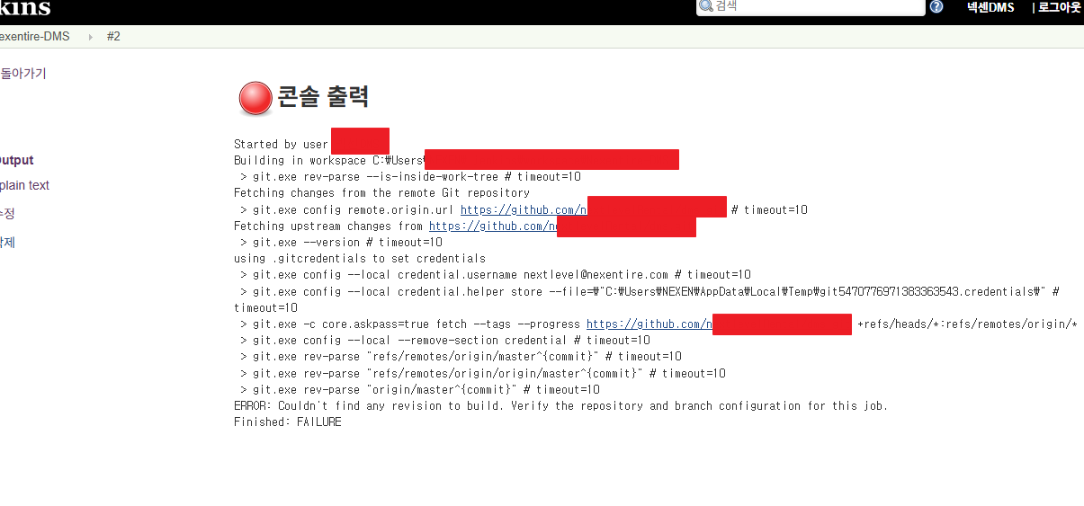 인증은 통과했지만 빌드할 브랜치(커밋)을 못 찾아서 실패한 상황이다