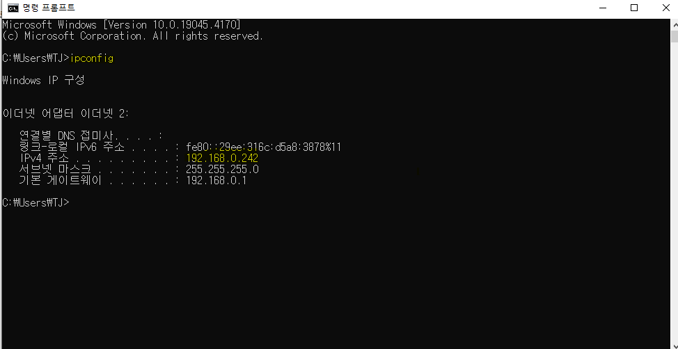 명령프롬프트(cmd)에 들어가서 ipconfig 를 입력하면 내 컴퓨터의 ip주소가 나온다