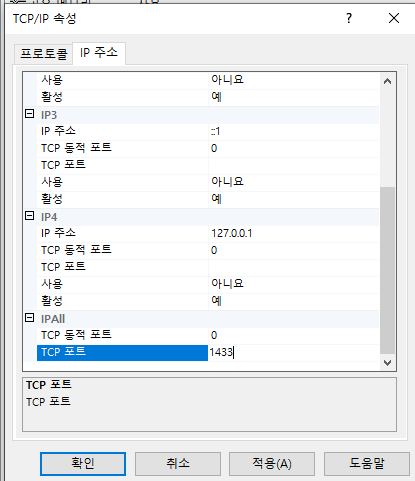 구성 ㅡ 프로토콜 ㅡ TCP/IP ㅡ 속성 ㅡ 사용으로 바꿔줌