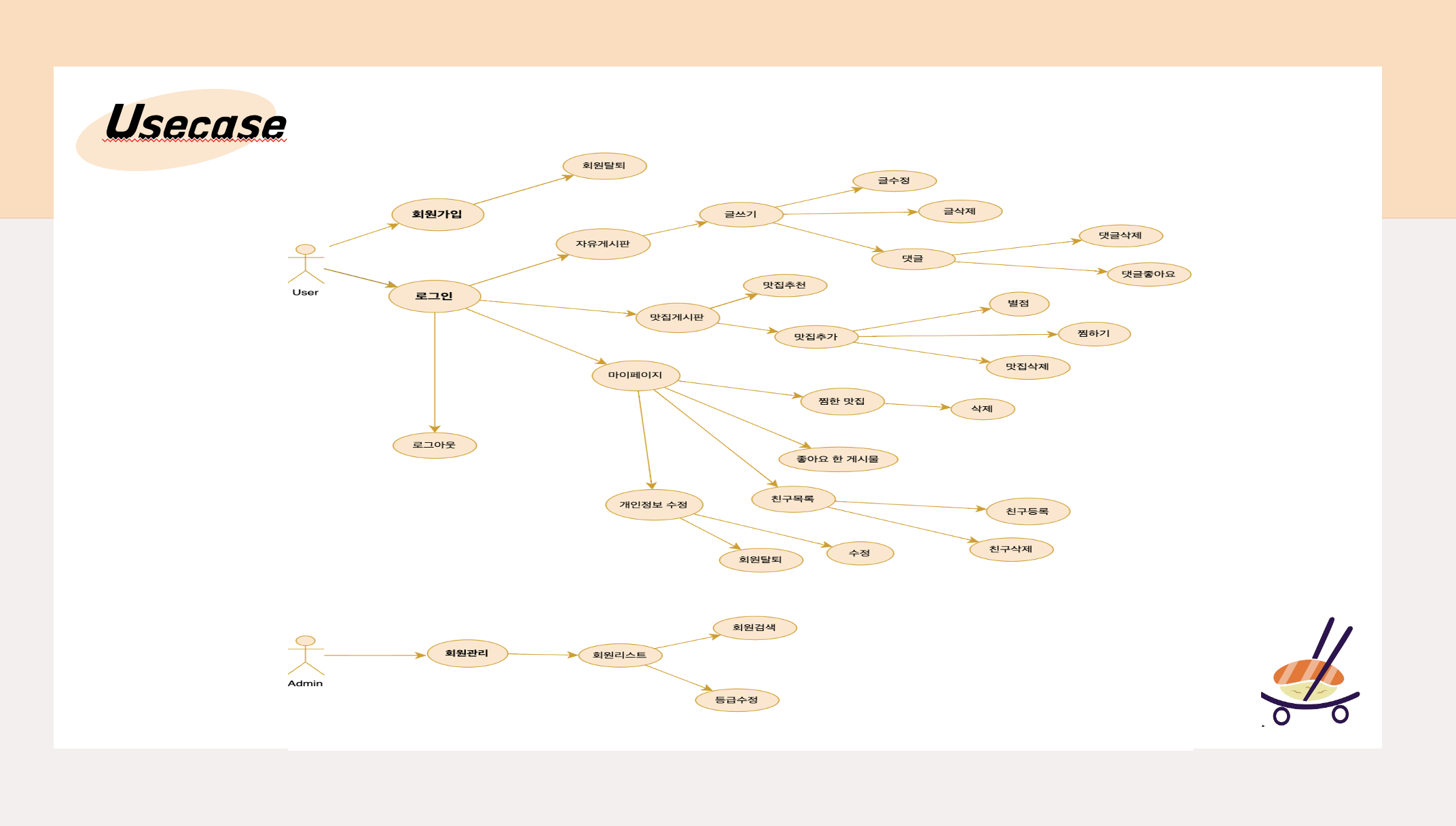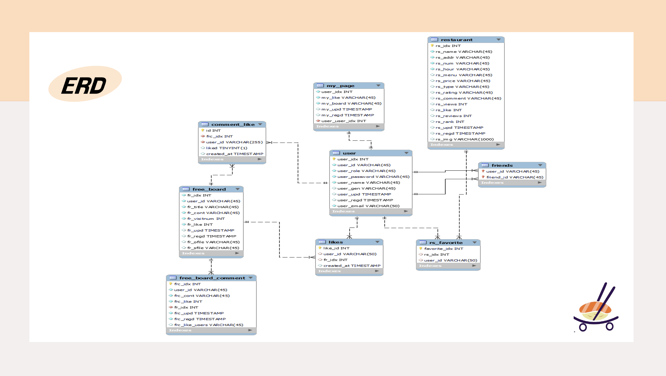 유저/ 레스토랑/ 마이페이지/ 자유게시판/ 자유게시판 댓글/ 레스토랑 좋아요/ 친구/ 댓글 좋아요/ 좋아요