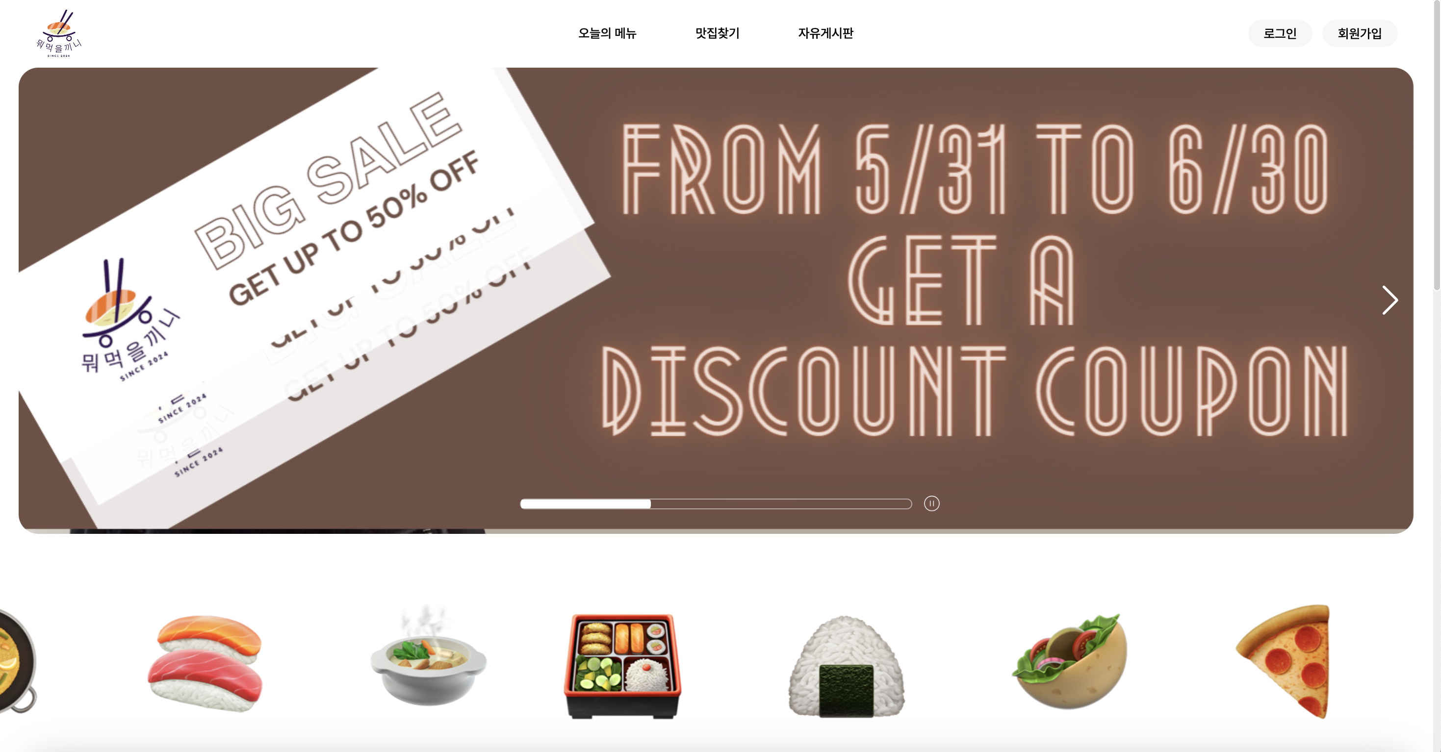 헤더는 고정시켜서 로고와 오늘의 메뉴/ 맛집찾기/ 자유게시판 항목으로 바로 이동할 수 있도록 두었다.