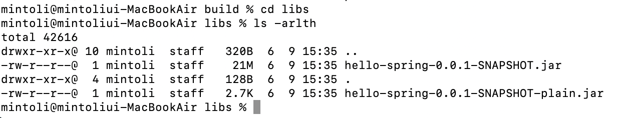 그리고 내부를 확인해주면 hello-spring-0.0.1-SNAPSHOT.jar 라는 녀석이 생겨있따.