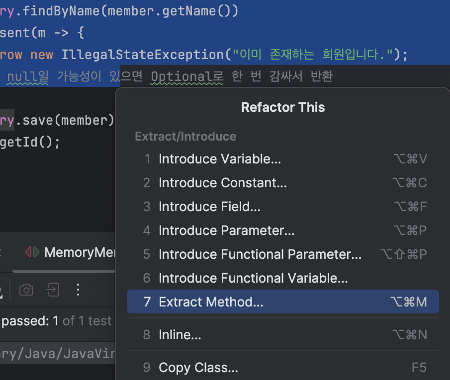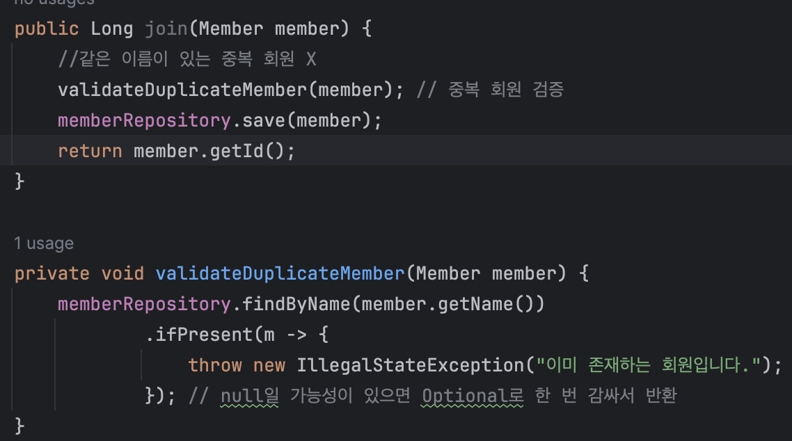메서드명은 validateDuplicateMember로 설정해줬다.