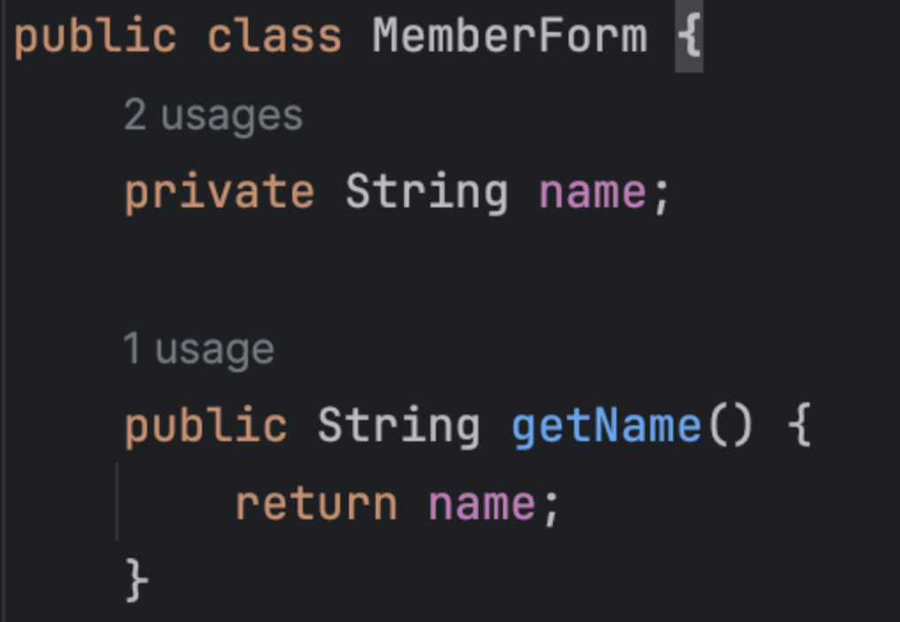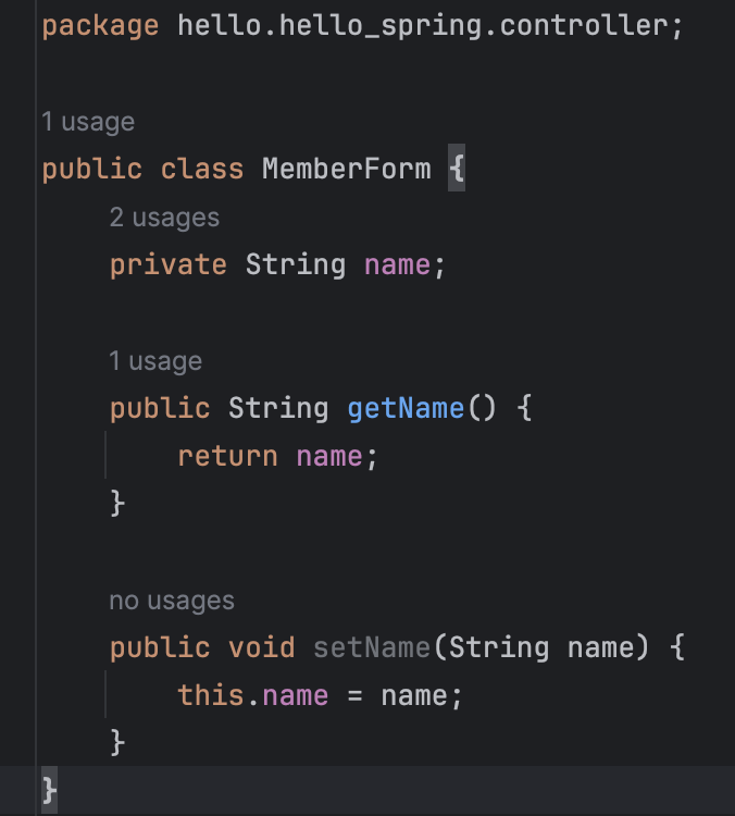 name="name"이 post로 name 데이터를 넘겨주고 스프링이 하단의 setName으로 값을 넘겨준다.
