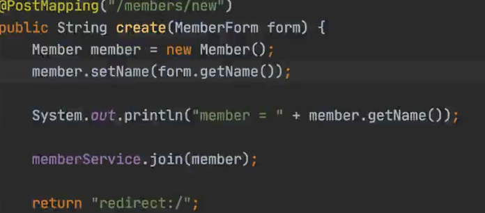 post방식으로 넘어가면 name값은 MemberController의 @PostMapping을 통과하여 create라는 메서드가 호출되면서 값이 들어온다.