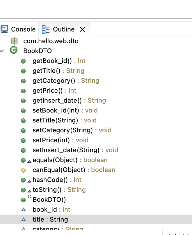 이 과정을 다 거치고 sts(이클립스) 내 Outline 윈도우를 보면 getter/setter를 쓰지 않고도 get/set 메서드가 성공적으로 뜨는 것을 확인할 수 있다.