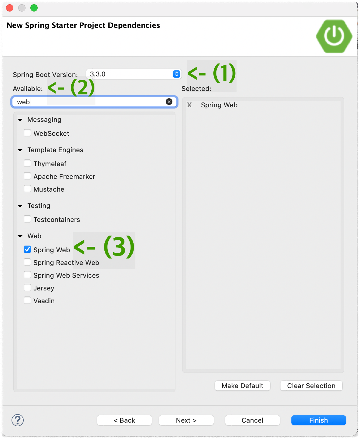 - (3) : 'Spring Web' 선택 (웹 기능 사용 시 필히 체크)