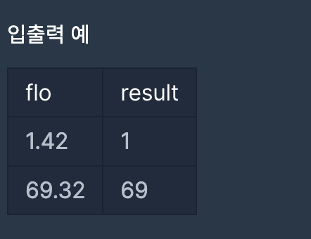 실수 flo가 매개 변수로 주어질 때, flo의 정수 부분을 return하도록 solution 함수를 완성해주세요.